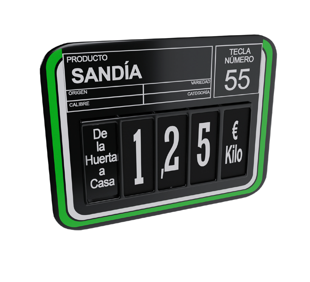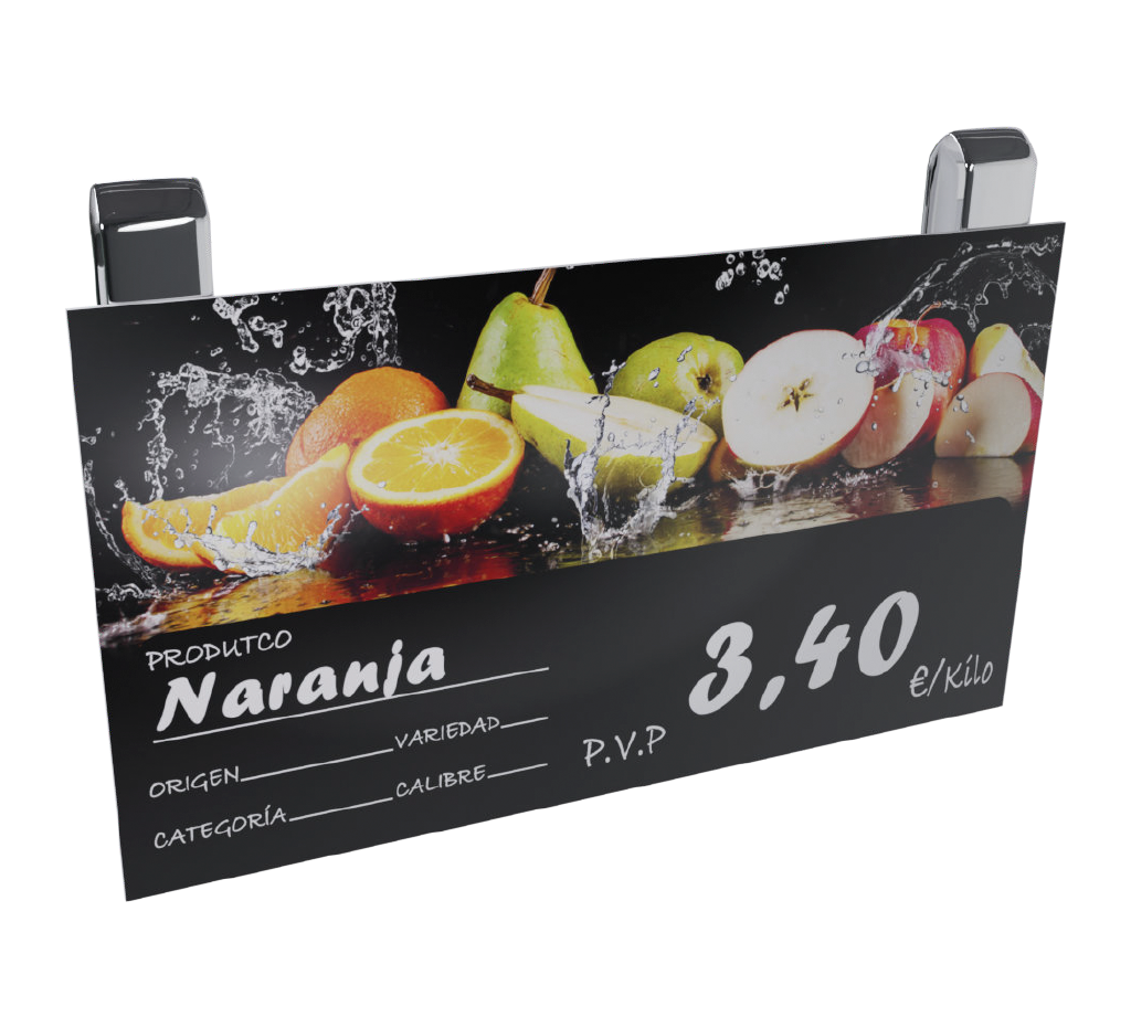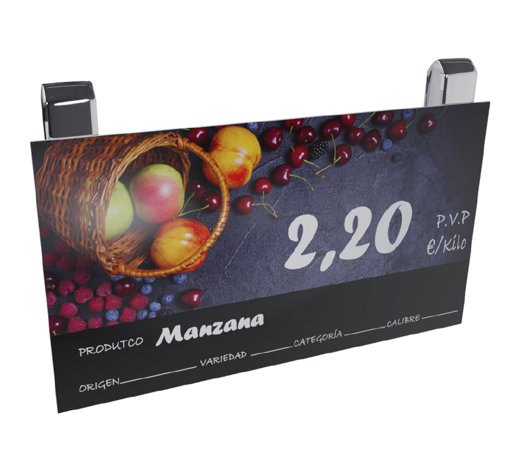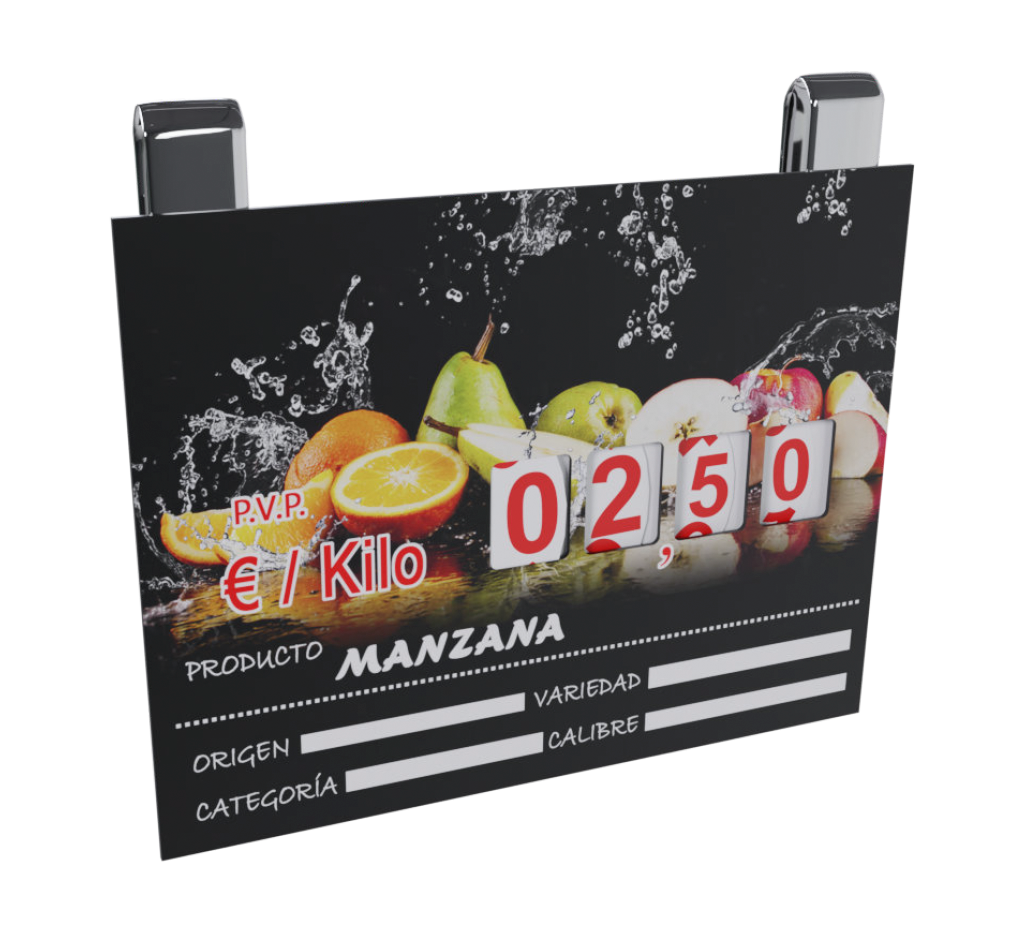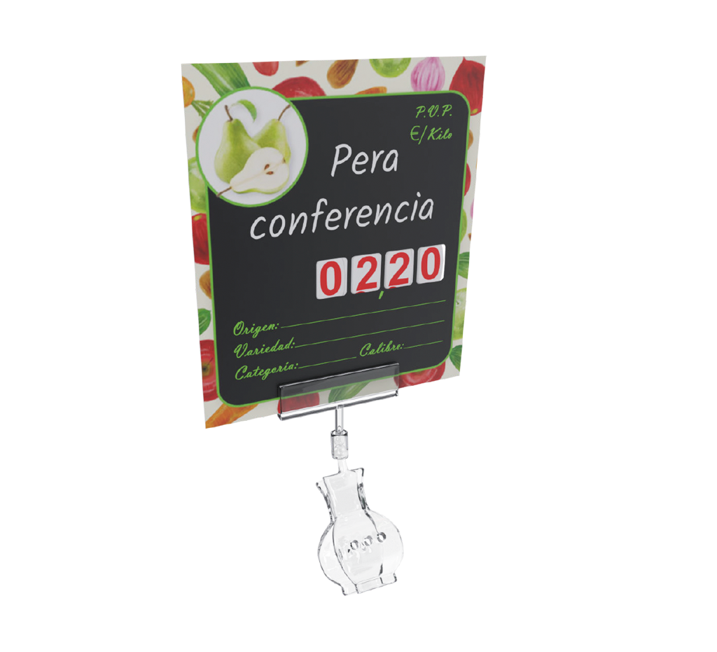 Portador de preços de PVC, com sistema de roleta para definir o preço.
